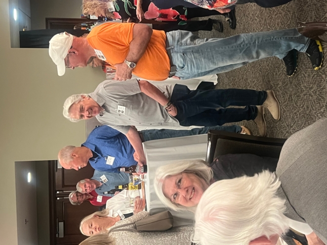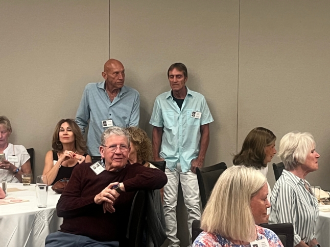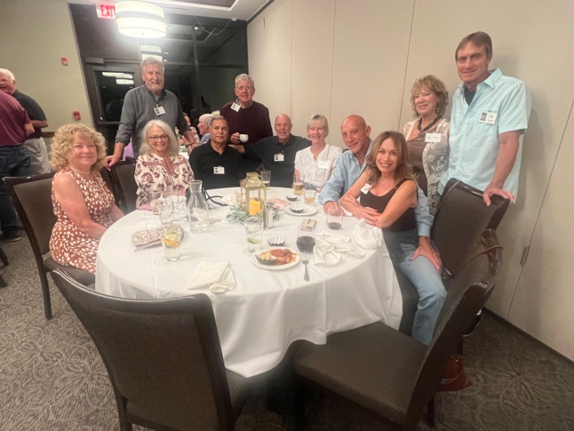 Left Photo, L to R: Judy Swarm; Chip/Walt Dilg (deep rear); Glenn Reynolds (Class of ’69 visitor); Barb Becker Robertson (near foreground); Don Davies (Judy Swarm’s husband); Mike Conway; Jeff Reno; Barb Dickinson Crain (far right background); Right Photo, L to R, seated: Dawn Spencer; Glenn Reynolds (Class of ’69 visitor); Ralph Klein; Paul Salerno